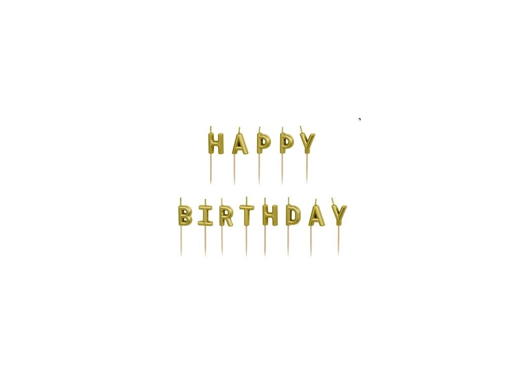 Elegantné narodeninové sviečky s nápisom Happy Birthday v zlatej farbe.