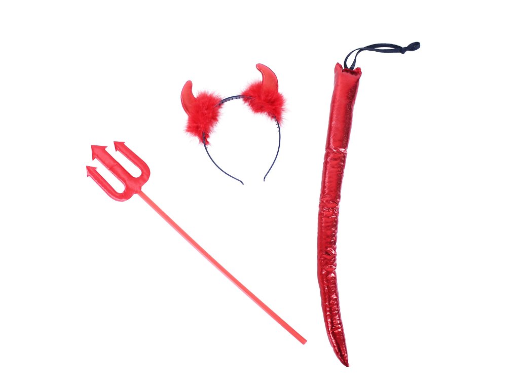 Roztomilá čertovská sada, v ktorej nájdete čelenku s rohmi, chvost a prútik v tvare vidlice.