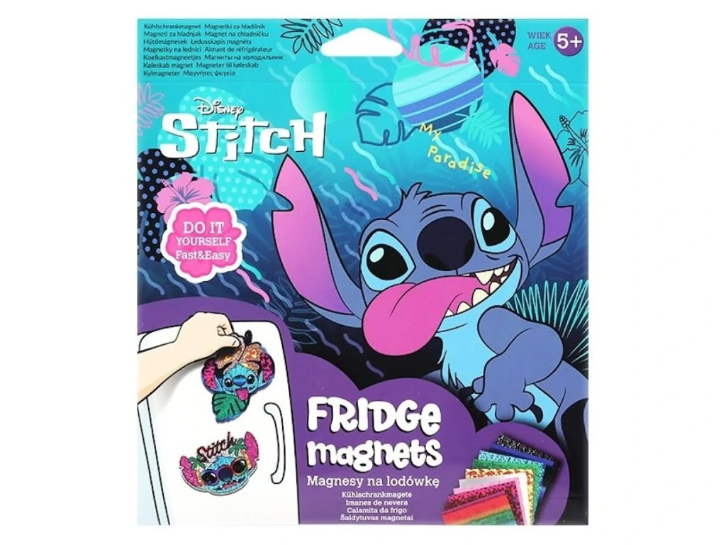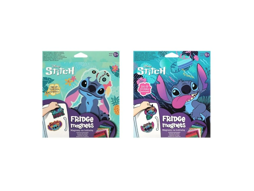 Tento fantastický kreatívny set vám umožní vytvoriť si vlastné magnetky s obľúbeným motívom Stitcha. Set obsahuje 4 magnetky a 10 farebných fólií, ktoré sú pripravené na dekorovanie. Všetko, čo musíte urobiť, je odstrániť biely papier z magnetu, položiť farebnú fóliu s lepidlom a pevne pritlačiť. Potom jednoducho odstránite zvyšok fólie a opakujte tento postup s ďalšími farbami, aby ste získali unikátny dizajn. Tento set je ideálny na tvorivé popoludnie, skvelý spôsob, ako stráviť čas doma, a dokonale sa hodí aj ako darček. Vytvorte zábavné a farebné magnetky, ktoré dodajú iskru a život každej chladničke!