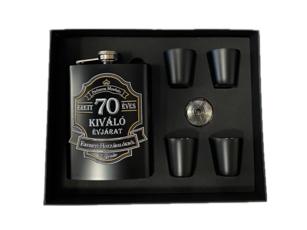 Táto luxusná sada obsahuje čiernu metalickú ploskačku s nápisom „Érett 70 éves – kiváló évjárat“ a štyri čierne poháriky. Súčasťou balenia je aj kovový lievik pre jednoduché plnenie.