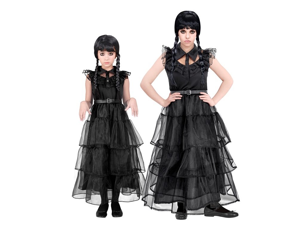 Štýlový detský kostým „Dark Girl“ pre dievčatá, pozostávajúci zo šiat a opasku, ideálny na karnevaly, tematické oslavy, Halloween alebo kostýmové párty. Tmavý, výrazný dizajn je vhodný pre dievčatá, ktoré majú rady originálne a trochu tajomné kostýmy.