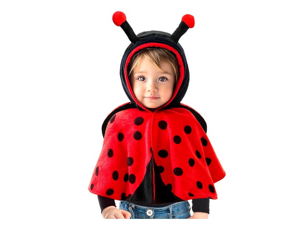 Roztomilý detský kostým plyšovej lienky v podobe ponča s kapucňou, ktorý je ideálny na karnevaly, tematické oslavy, školské podujatia alebo detské párty. Mäkký plyšový materiál zabezpečuje pohodlie a teplo, zároveň vytvára veselý a rozpoznateľný vzhľad.