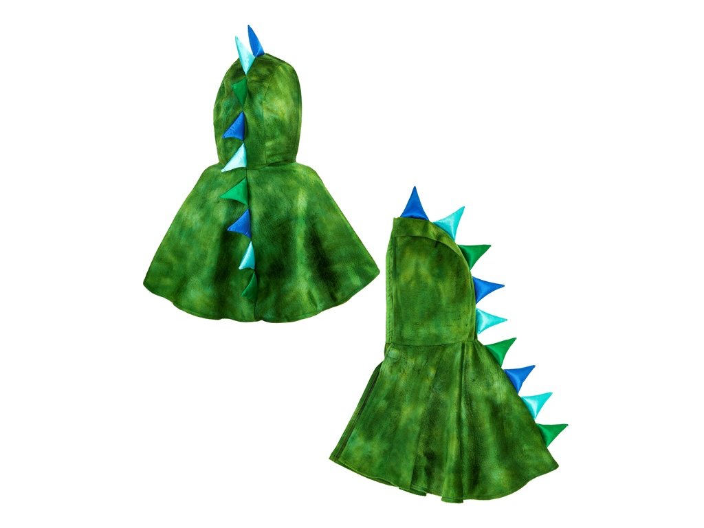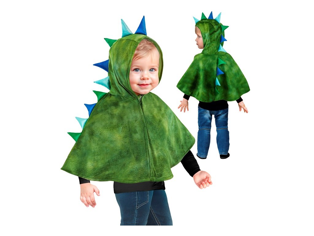 Veselý detský kostým plyšového dinosaura v podobe ponča s kapucňou, ktorý je ideálny na karnevaly, tematické oslavy, školské podujatia alebo detské párty. Mäkký plyšový materiál zabezpečuje pohodlné nosenie a zároveň poskytuje teplo počas chladnejších dní.