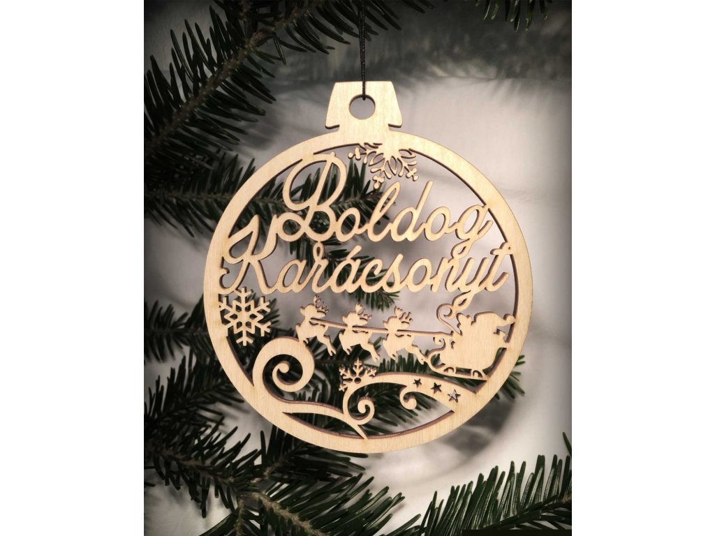 Drevená ozdoba na stromček guľatá s maďarským nápisom "Boldog Karácsonyt"