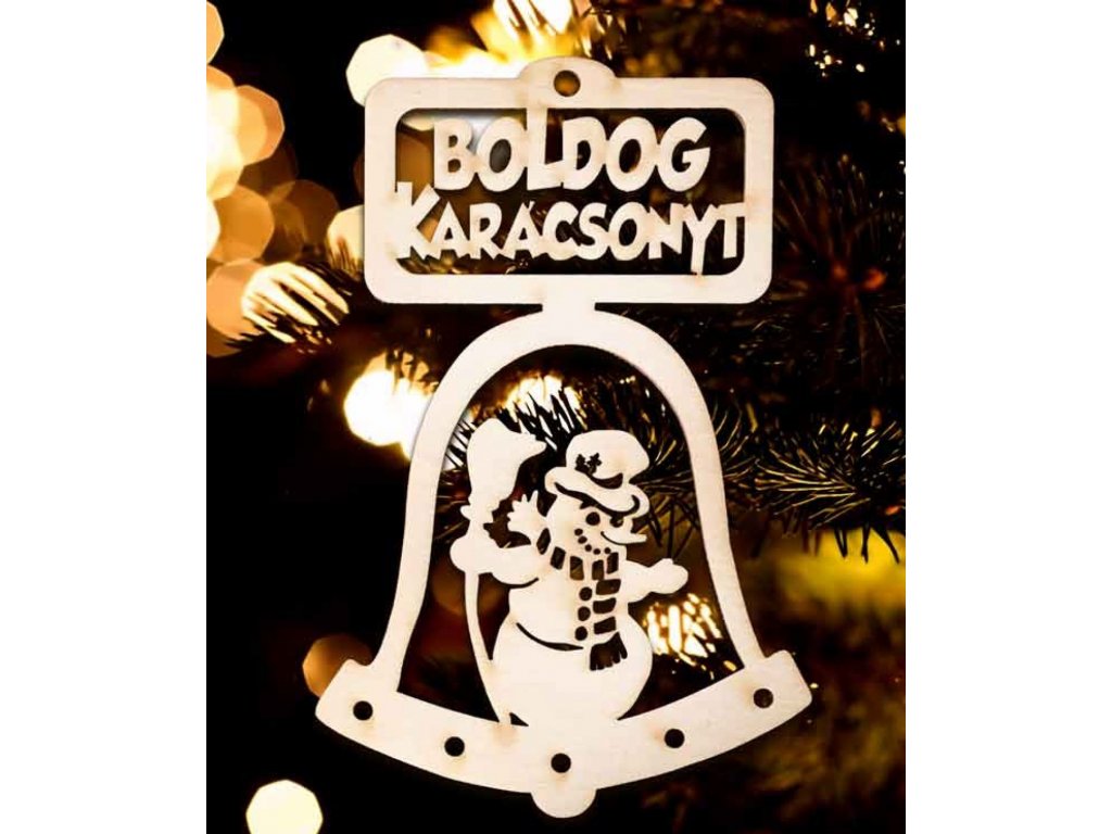Drevená ozdoba na stromček - Snehuliak s maďarským nápisom "Boldog karácsonyt"
