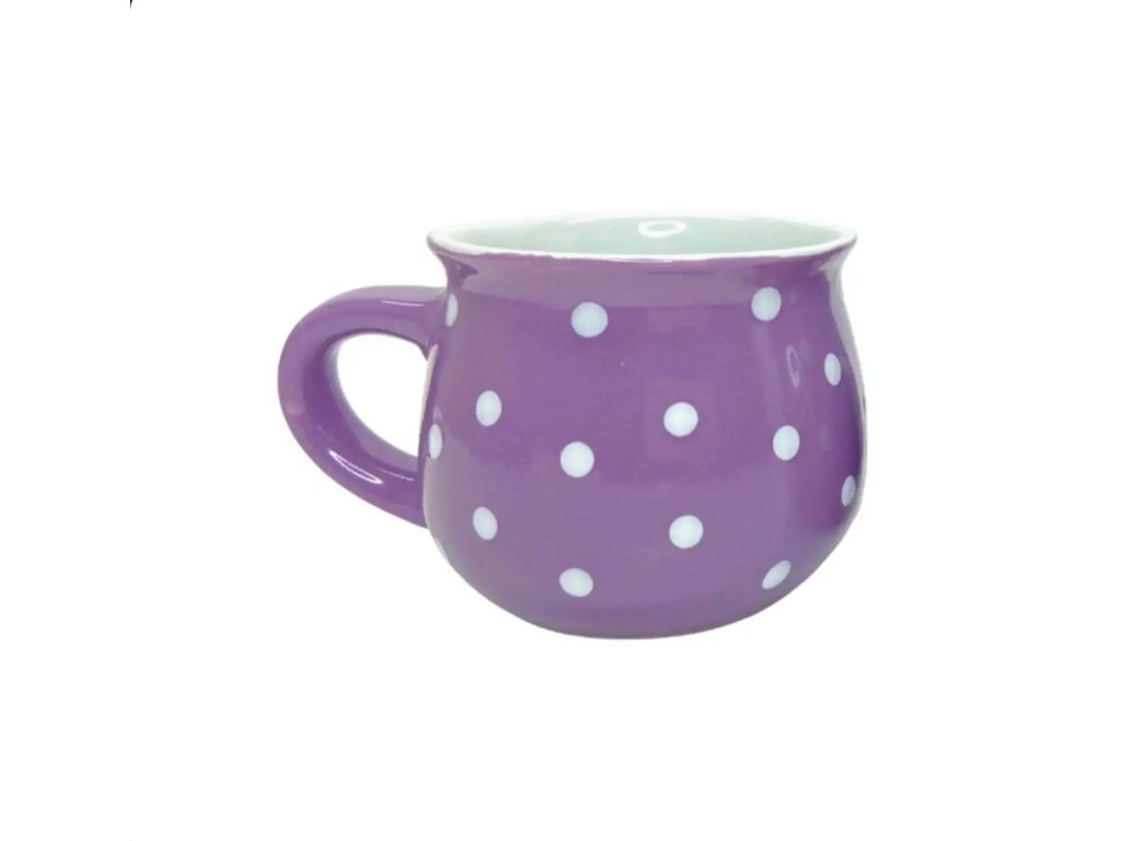 Fialová farba s bielymi bodkami pôsobí jemne a ženský dizajn robí z hrnčeka krásny aj praktický suvenír.