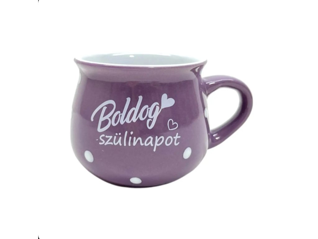 Hrnček „Boldog szülinapot“ – fialový s bodkami