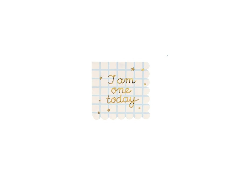 Luxusné papierové servítky s motívom medvedíka a jemne modrou kockou na krémovom pozadí, doplnené zlatým nápisom „I am one today“. Ideálne na prvé narodeniny – elegantné a praktické zároveň.