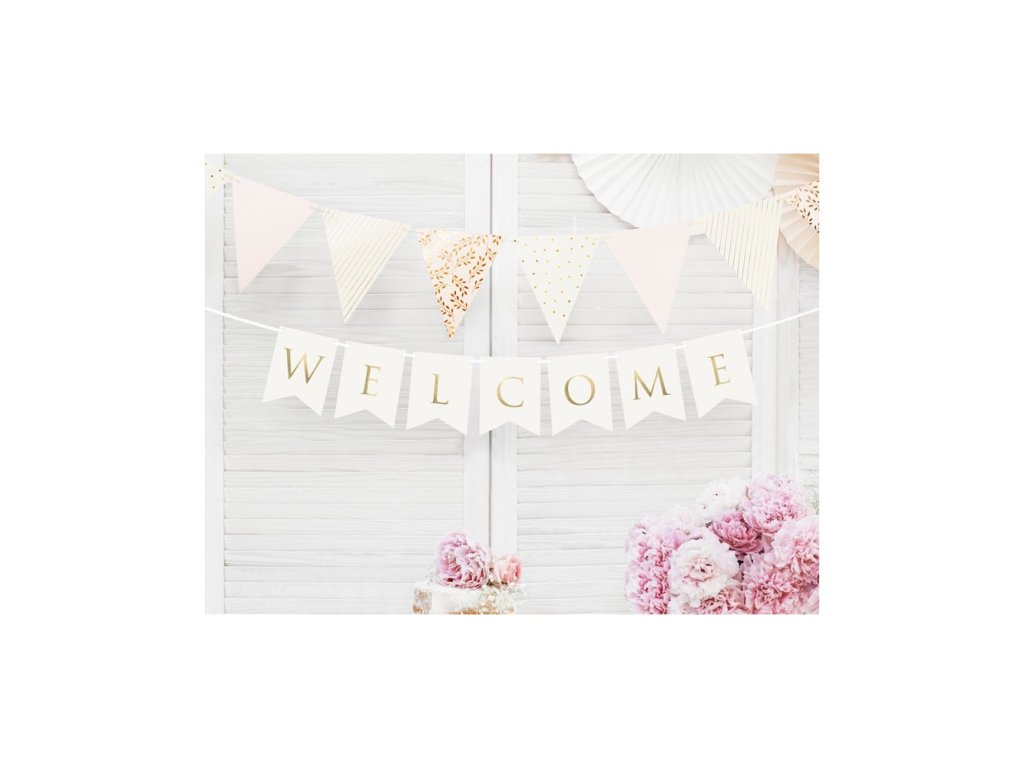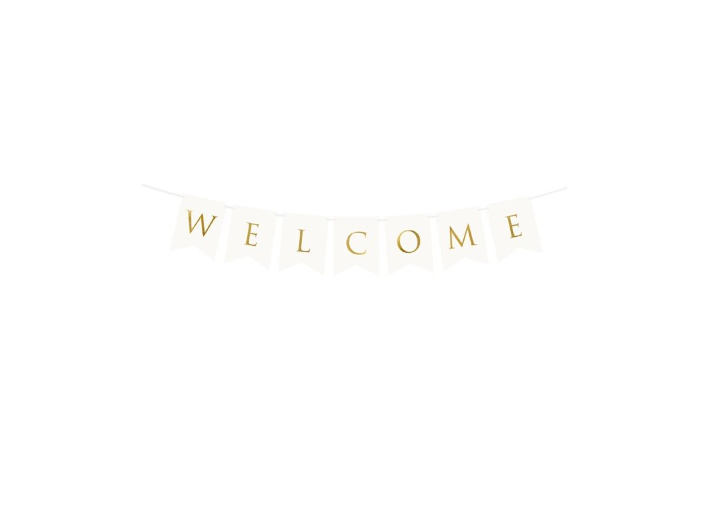 Papierový baner „WELCOME“ – biela s zlatými písmenami (15 × 95 cm)