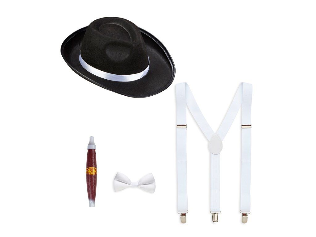 Sada gangstra z 20. rokov, teda klobúk, traky, mucha, a cigara je mapovaním elegacnji a gangsterskej klímy. Táto sada je vynikajúcim nápadom pre tých, ktorí chcú vyjadriť svoj štýl s triedou a sebavedomím.